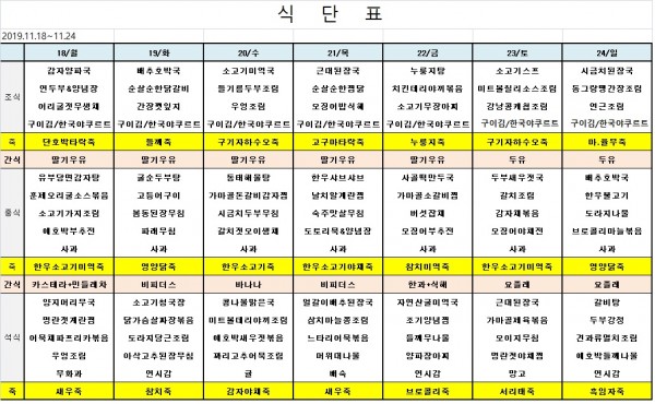 11월 셋째주 식단표 페이지 정보 작성자 은천노인복지회 작성일19-11-15 14:42 조회37,550회 댓글0건 관련링크 이전글 다음글 목록 답변 본문 ※ 모든 식사에는 잡곡밥과 김치가 제공됩니다. ※ 식단은 식재료수급에 의해 변경될 수 있습니다. 이전글 다음글 목록 답변