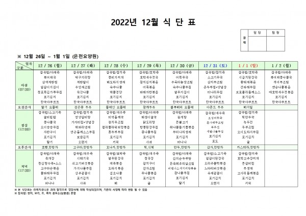 12월 넷째주 식단표 페이지 정보 작성자 은천노인복지회 작성일22-12-26 14:01 조회77,551회 댓글0건 관련링크 이전글 다음글 목록 답변 본문 . 이전글 다음글 목록 답변