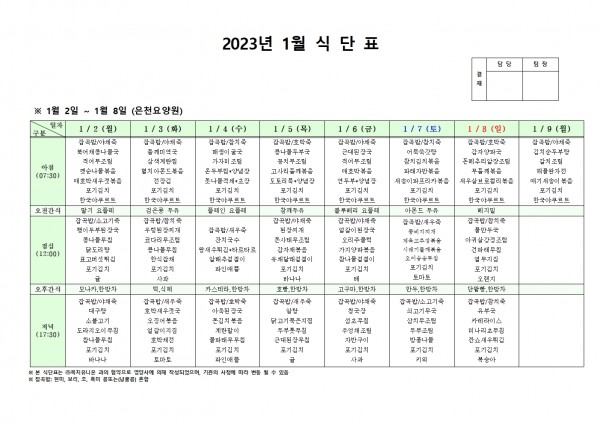 23년 1월 첫째주 식단표 페이지 정보 작성자 은천노인복지회 작성일22-12-30 15:21 조회76,422회 댓글0건 관련링크 이전글 다음글 목록 답변 본문 . 이전글 다음글 목록 답변