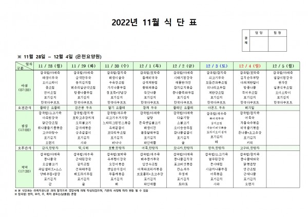 11월 넷째주 식단표 페이지 정보 작성자 은천노인복지회 작성일22-11-24 16:56 조회81,831회 댓글0건 관련링크 이전글 다음글 목록 답변 본문 . 이전글 다음글 목록 답변