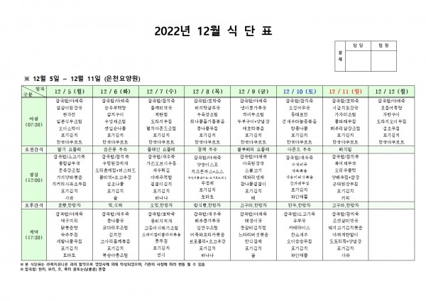 12월 첫째주 식단표 페이지 정보 작성자 은천노인복지회 작성일22-12-01 17:14 조회80,445회 댓글0건 관련링크 이전글 다음글 목록 답변 본문 . 이전글 다음글 목록 답변