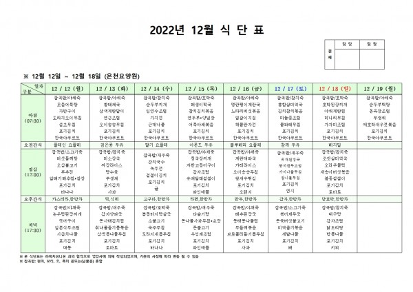 12월 둘째주 식단표 페이지 정보 작성자 은천노인복지회 작성일22-12-08 14:20 조회79,635회 댓글0건 관련링크 이전글 다음글 목록 답변 본문 . 이전글 다음글 목록 답변