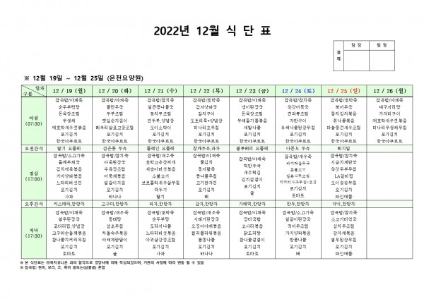 12월 셋째주 식단표 페이지 정보 작성자 은천노인복지회 작성일22-12-16 15:00 조회79,125회 댓글0건 관련링크 이전글 다음글 목록 답변 본문 . 이전글 다음글 목록 답변