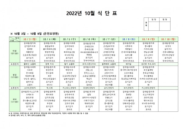 10월 첫째주 식단표 페이지 정보 작성자 은천노인복지회 작성일22-10-04 09:59 조회86,247회 댓글0건 관련링크 이전글 다음글 목록 답변 본문 . 이전글 다음글 목록 답변