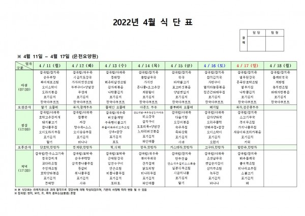 4월 둘째주 식단표 페이지 정보 작성자 은천노인복지회 작성일22-04-11 16:27 조회102,057회 댓글0건 관련링크 이전글 다음글 목록 답변 본문 . 이전글 다음글 목록 답변
