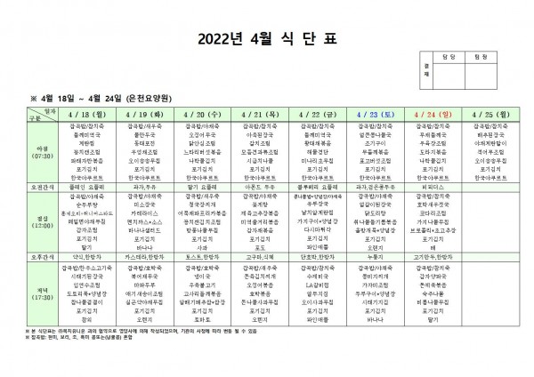 4월 셋째주 식단표 페이지 정보 작성자 은천노인복지회 작성일22-04-14 17:03 조회100,742회 댓글0건 관련링크 이전글 다음글 목록 답변 본문 . 이전글 다음글 목록 답변