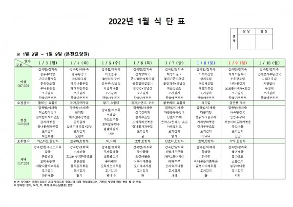 2022년 1월 첫째주 식단표 페이지 정보 작성자 은천노인복지회 작성일21-12-30 17:37 조회112,230회 댓글0건 관련링크 이전글 다음글 목록 답변 본문 . 이전글 다음글 목록 답변