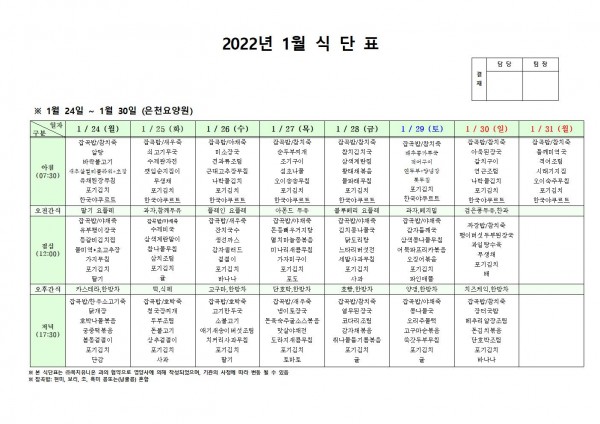 1월 넷째주 식단표 페이지 정보 작성자 은천노인복지회 작성일22-01-25 09:24 조회110,814회 댓글0건 관련링크 이전글 다음글 목록 답변 본문 . 이전글 다음글 목록 답변
