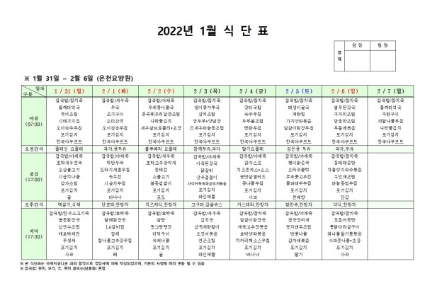 2월 첫째주 식단표 페이지 정보 작성자 은천노인복지회 작성일22-01-29 11:54 조회109,337회 댓글0건 관련링크 이전글 다음글 목록 답변 본문 . 이전글 다음글 목록 답변