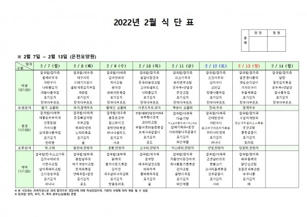 2월 둘째주 식단표 페이지 정보 작성자 은천노인복지회 작성일22-02-04 18:58 조회109,962회 댓글0건 관련링크 이전글 다음글 목록 답변 본문 . 이전글 다음글 목록 답변