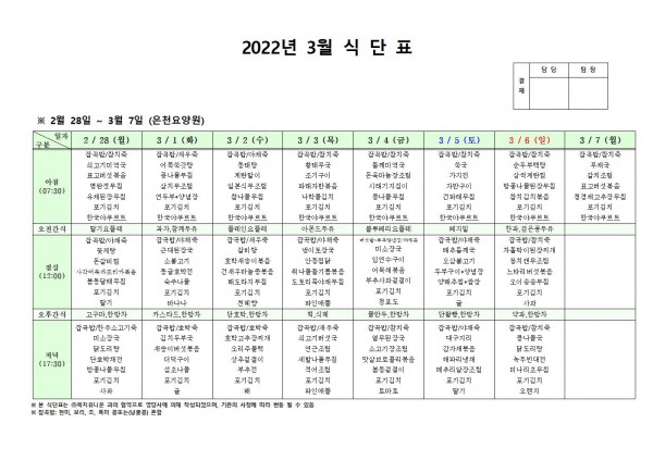 3월 첫째주 식단표 페이지 정보 작성자 은천노인복지회 작성일22-02-25 09:22 조회107,039회 댓글0건 관련링크 이전글 다음글 목록 답변 본문 . 이전글 다음글 목록 답변