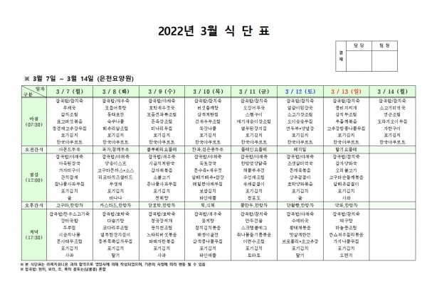 3월 둘째주 식단표 페이지 정보 작성자 은천노인복지회 작성일22-03-04 09:58 조회105,160회 댓글0건 관련링크 이전글 다음글 목록 답변 본문 . 이전글 다음글 목록 답변