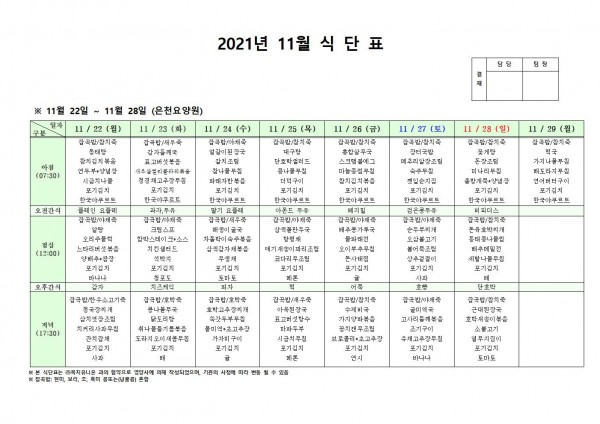 11월 넷째주 식단표 페이지 정보 작성자 은천노인복지회 작성일21-11-25 17:12 조회116,124회 댓글0건 관련링크 이전글 다음글 목록 답변 본문 . 이전글 다음글 목록 답변