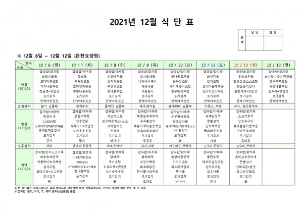 12월 둘째주 식단표 페이지 정보 작성자 은천노인복지회 작성일21-12-03 10:52 조회114,282회 댓글0건 관련링크 이전글 다음글 목록 답변 본문 . 이전글 다음글 목록 답변