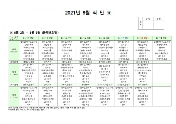 8월 첫째주 식단표 페이지 정보 작성자 은천노인복지회 작성일21-08-05 10:26 조회122,631회 댓글0건 관련링크 이전글 다음글 목록 답변 본문 . 이전글 다음글 목록 답변