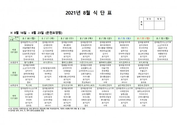 8월 셋째주 식단표 페이지 정보 작성자 은천노인복지회 작성일21-08-12 17:43 조회121,624회 댓글0건 관련링크 이전글 다음글 목록 답변 본문 . 이전글 다음글 목록 답변