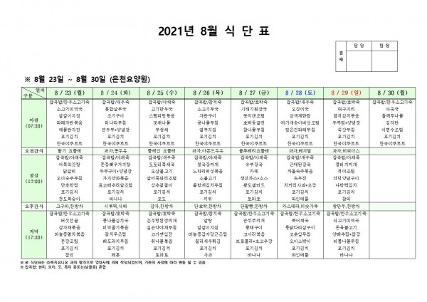 8월 넷째주 식단표 페이지 정보 작성자 은천노인복지회 작성일21-08-19 17:44 조회121,826회 댓글0건 관련링크 이전글 다음글 목록 답변 본문 . 이전글 다음글 목록 답변
