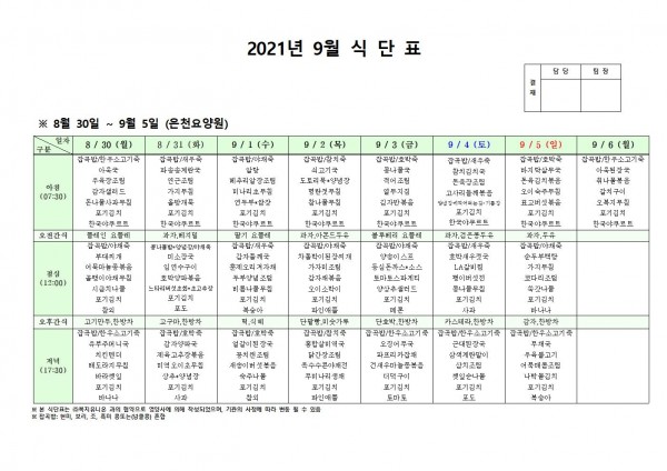 9월 첫째주 식단표 페이지 정보 작성자 은천노인복지회 작성일21-08-26 17:14 조회119,763회 댓글0건 관련링크 이전글 다음글 목록 답변 본문 . 이전글 다음글 목록 답변