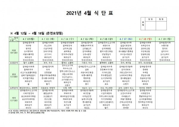 4월 둘째주 식단표 페이지 정보 작성자 은천노인복지회 작성일21-04-08 19:12 조회130,834회 댓글0건 관련링크 이전글 다음글 목록 답변 본문 4월 둘째주 식단표 이전글 다음글 목록 답변