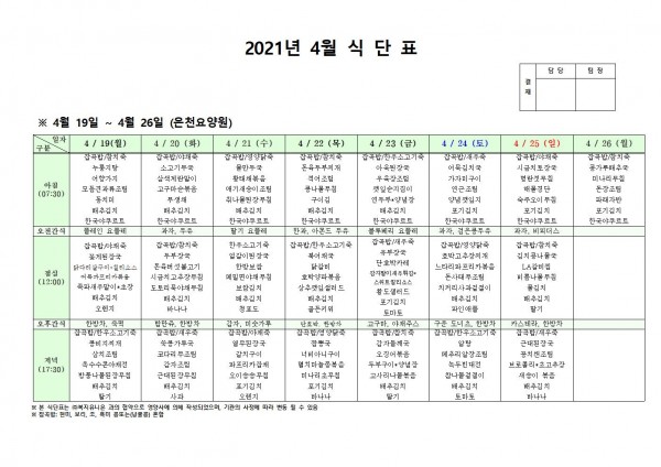 4월 셋째주 식단표 페이지 정보 작성자 은천노인복지회 작성일21-04-15 19:35 조회131,241회 댓글0건 관련링크 이전글 다음글 목록 답변 본문 4월 셋째주 식단표 이전글 다음글 목록 답변