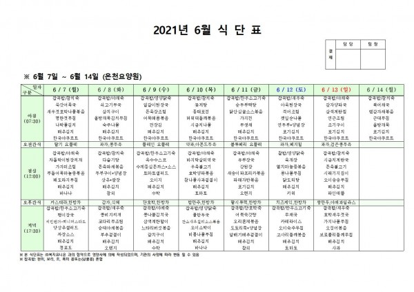 6월 둘째주 식단표 페이지 정보 작성자 은천노인복지회 작성일21-06-03 17:20 조회125,606회 댓글0건 관련링크 이전글 다음글 목록 답변 본문 . 이전글 다음글 목록 답변