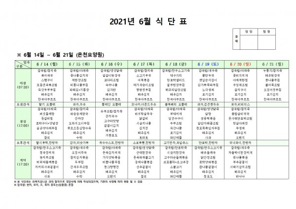 6월 셋째주 식단표 페이지 정보 작성자 은천노인복지회 작성일21-06-11 10:28 조회125,083회 댓글0건 관련링크 이전글 다음글 목록 답변 본문 . 이전글 다음글 목록 답변