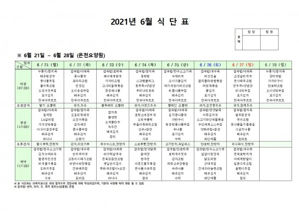 6월 넷째주 식단표 페이지 정보 작성자 은천노인복지회 작성일21-06-17 15:01 조회124,585회 댓글0건 관련링크 이전글 다음글 목록 답변 본문 . 이전글 다음글 목록 답변