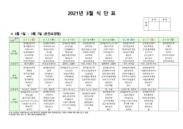 3월 첫째주 식단표 페이지 정보 작성자 은천노인복지회 작성일21-02-25 16:45 조회135,946회 댓글0건 관련링크 이전글 다음글 목록 답변 본문 식단표 [이 게시물은 은천노인복지회님에 의해 2021-03-12 17:18:24 공지사항에서 이동 됨] 이전글 다음글 목록 답변