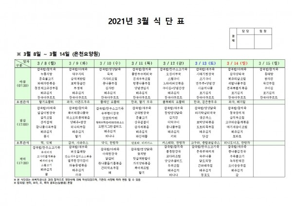 3월 둘째주 식단표 페이지 정보 작성자 은천노인복지회 작성일21-03-04 17:55 조회135,084회 댓글0건 관련링크 이전글 다음글 목록 답변 본문 3월 식단표 [이 게시물은 은천노인복지회님에 의해 2021-03-12 17:18:24 공지사항에서 이동 됨] 이전글 다음글 목록 답변