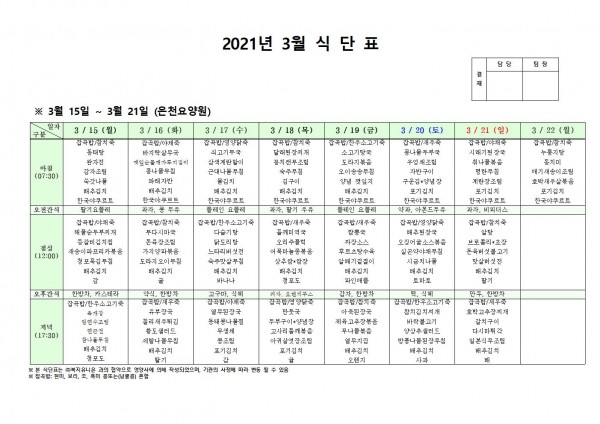 3월 셋째주 식단표 페이지 정보 작성자 은천노인복지회 작성일21-03-12 11:41 조회134,638회 댓글0건 관련링크 이전글 다음글 목록 답변 본문 3월 셋째주 식단표[이 게시물은 은천노인복지회님에 의해 2021-03-12 17:18:24 공지사항에서 이동 됨] 이전글 다음글 목록 답변