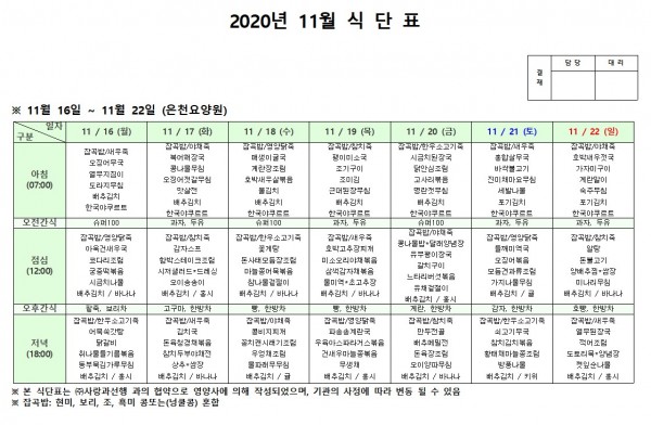 11월 셋째주 식단표 페이지 정보 작성자 은천노인복지회 작성일20-12-08 18:10 조회146,216회 댓글0건 관련링크 이전글 다음글 목록 답변 본문 . 이전글 다음글 목록 답변
