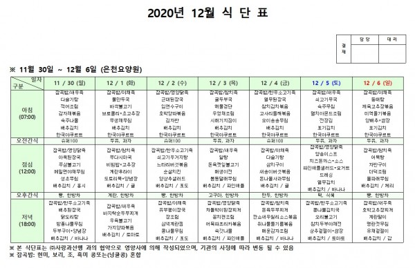 12월 첫째주 식단표 페이지 정보 작성자 은천노인복지회 작성일20-12-08 18:10 조회144,853회 댓글0건 관련링크 이전글 다음글 목록 답변 본문 . 이전글 다음글 목록 답변