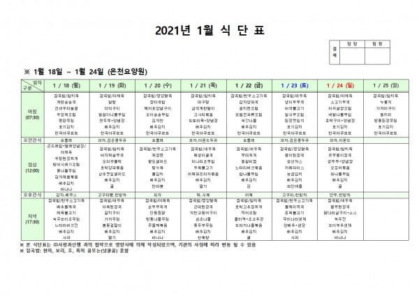 1월 셋째주 식단표 페이지 정보 작성자 은천노인복지회 작성일21-01-15 10:02 조회139,248회 댓글0건 관련링크 이전글 다음글 목록 답변 본문 . 이전글 다음글 목록 답변