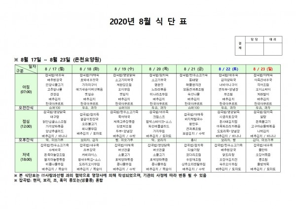 8월 셋째주 식단표 페이지 정보 작성자 은천노인복지회 작성일20-08-25 16:01 조회154,257회 댓글0건 관련링크 이전글 다음글 목록 답변 본문 . 이전글 다음글 목록 답변