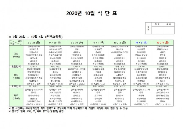 10월 첫째주 식단표 페이지 정보 작성자 은천노인복지회 작성일20-10-12 14:45 조회151,118회 댓글0건 관련링크 이전글 다음글 목록 답변 본문 . 이전글 다음글 목록 답변