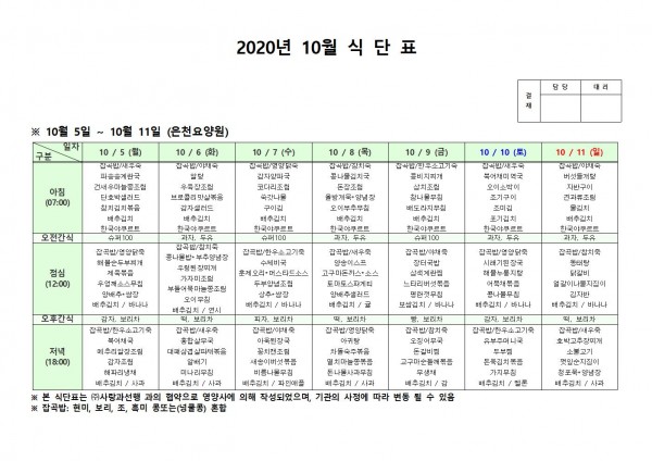 10월 둘째주 식단표 페이지 정보 작성자 은천노인복지회 작성일20-10-12 14:45 조회151,513회 댓글0건 관련링크 이전글 다음글 목록 답변 본문 . 이전글 다음글 목록 답변