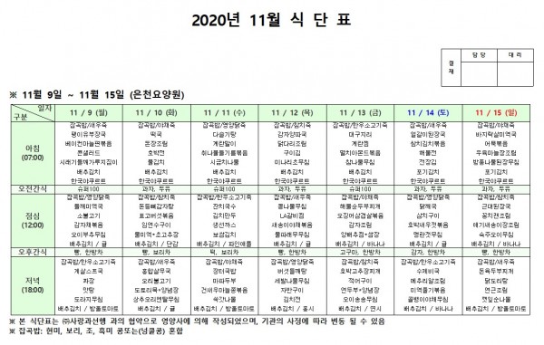 11월 둘째주 식단표 페이지 정보 작성자 은천노인복지회 작성일20-12-08 18:09 조회146,171회 댓글0건 관련링크 이전글 다음글 목록 답변 본문 11월 둘째주 식단표 이전글 다음글 목록 답변