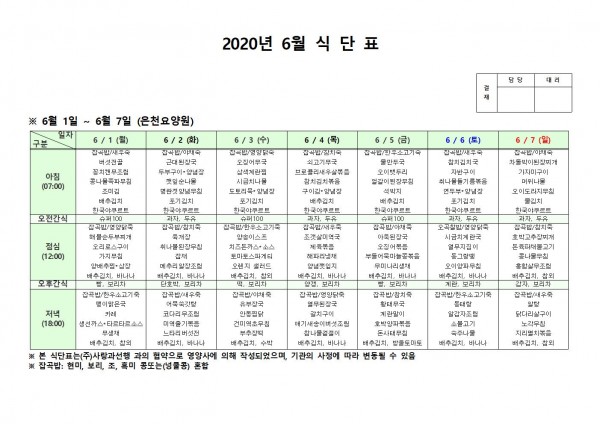 6월 첫째주 식단표 페이지 정보 작성자 은천노인복지회 작성일20-06-09 09:32 조회161,538회 댓글0건 관련링크 이전글 다음글 목록 답변 본문 호 이전글 다음글 목록 답변