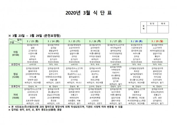 3월 넷째주 식단표 페이지 정보 작성자 은천노인복지회 작성일20-03-31 16:09 조회170,685회 댓글0건 관련링크 이전글 다음글 목록 답변 본문 . 이전글 다음글 목록 답변