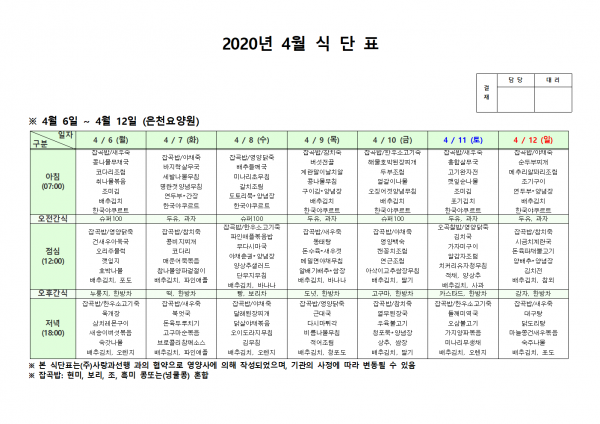 4월 첫째주 식단표 페이지 정보 작성자 은천노인복지회 작성일20-04-13 15:04 조회169,279회 댓글0건 관련링크 이전글 다음글 목록 답변 본문 . 이전글 다음글 목록 답변