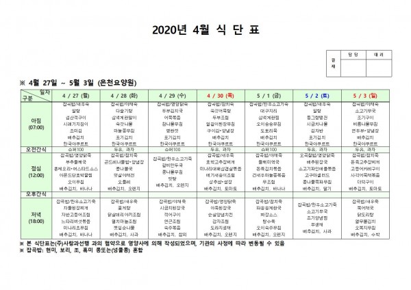 4월 넷째주 식단표 페이지 정보 작성자 은천노인복지회 작성일20-05-04 15:11 조회165,601회 댓글0건 관련링크 이전글 다음글 목록 답변 본문 . 이전글 다음글 목록 답변