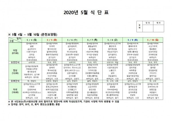 5월 첫째주 식단표 페이지 정보 작성자 은천노인복지회 작성일20-05-18 16:01 조회163,695회 댓글0건 관련링크 이전글 다음글 목록 답변 본문 . 이전글 다음글 목록 답변