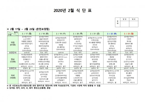 2월 셋째주 식단표 페이지 정보 작성자 은천노인복지회 작성일20-02-24 11:02 조회171,706회 댓글0건 관련링크 이전글 다음글 목록 답변 본문 . 이전글 다음글 목록 답변
