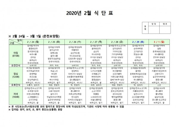 2월 넷째주 식단표 페이지 정보 작성자 은천노인복지회 작성일20-03-02 13:41 조회170,665회 댓글0건 관련링크 이전글 다음글 목록 답변 본문 2월 넷째주 식단표입니다 이전글 다음글 목록 답변