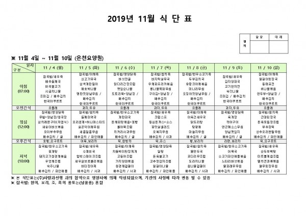 11월 첫째주 식단표 페이지 정보 작성자 은천노인복지회 작성일19-11-12 14:17 조회183,295회 댓글0건 관련링크 이전글 다음글 목록 답변 본문 11월 첫째주 식단표 이전글 다음글 목록 답변