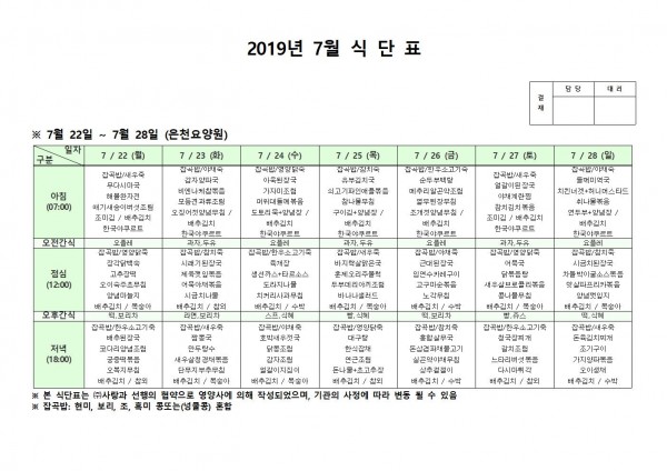 7월 넷째주 식단표 페이지 정보 작성자 은천노인복지회 작성일19-07-29 13:58 조회188,665회 댓글0건 관련링크 이전글 다음글 목록 답변 본문 7월 넷째주 식단표 이전글 다음글 목록 답변