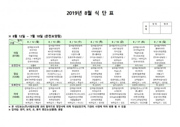 8월 셋째주 식단표 페이지 정보 작성자 은천노인복지회 작성일19-08-19 15:35 조회187,413회 댓글0건 관련링크 이전글 다음글 목록 답변 본문 8월 셋째주 식단표 이전글 다음글 목록 답변