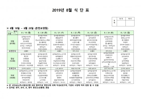8월 넷째주 식단표 페이지 정보 작성자 은천노인복지회 작성일19-08-26 16:38 조회186,188회 댓글0건 관련링크 이전글 다음글 목록 답변 본문 8월 넷째주 식단표 이전글 다음글 목록 답변