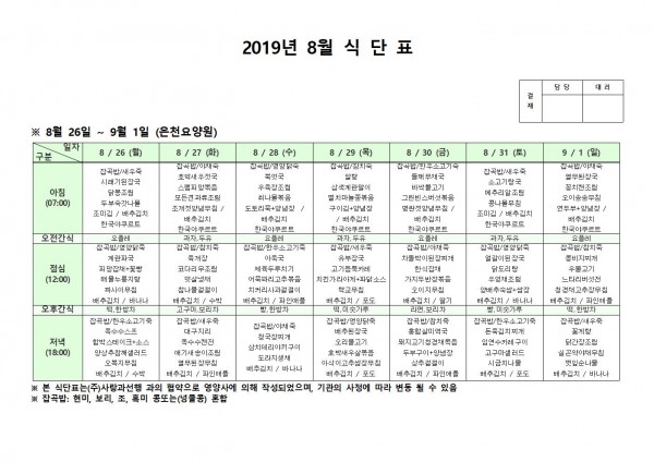 8월 다섯째주 식단표 페이지 정보 작성자 은천노인복지회 작성일19-09-04 17:29 조회187,659회 댓글0건 관련링크 이전글 다음글 목록 답변 본문 8월 다섯째주 식단표 이전글 다음글 목록 답변