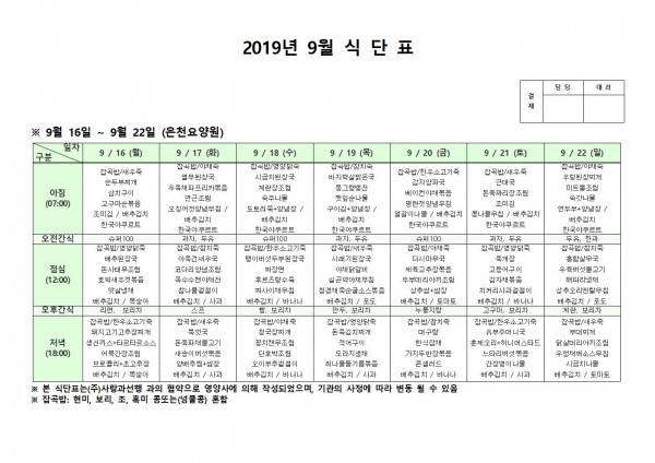 9월 셋째주 식단표 페이지 정보 작성자 은천노인복지회 작성일19-09-23 13:27 조회186,565회 댓글0건 관련링크 이전글 다음글 목록 답변 본문 . 이전글 다음글 목록 답변